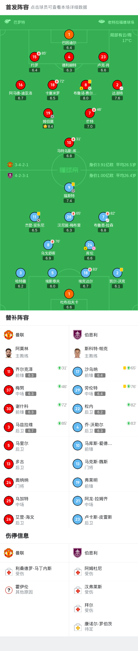 第26分钟,卡塞米罗头槌击中横梁后造成对方乌龙,曼联1-0伯恩利